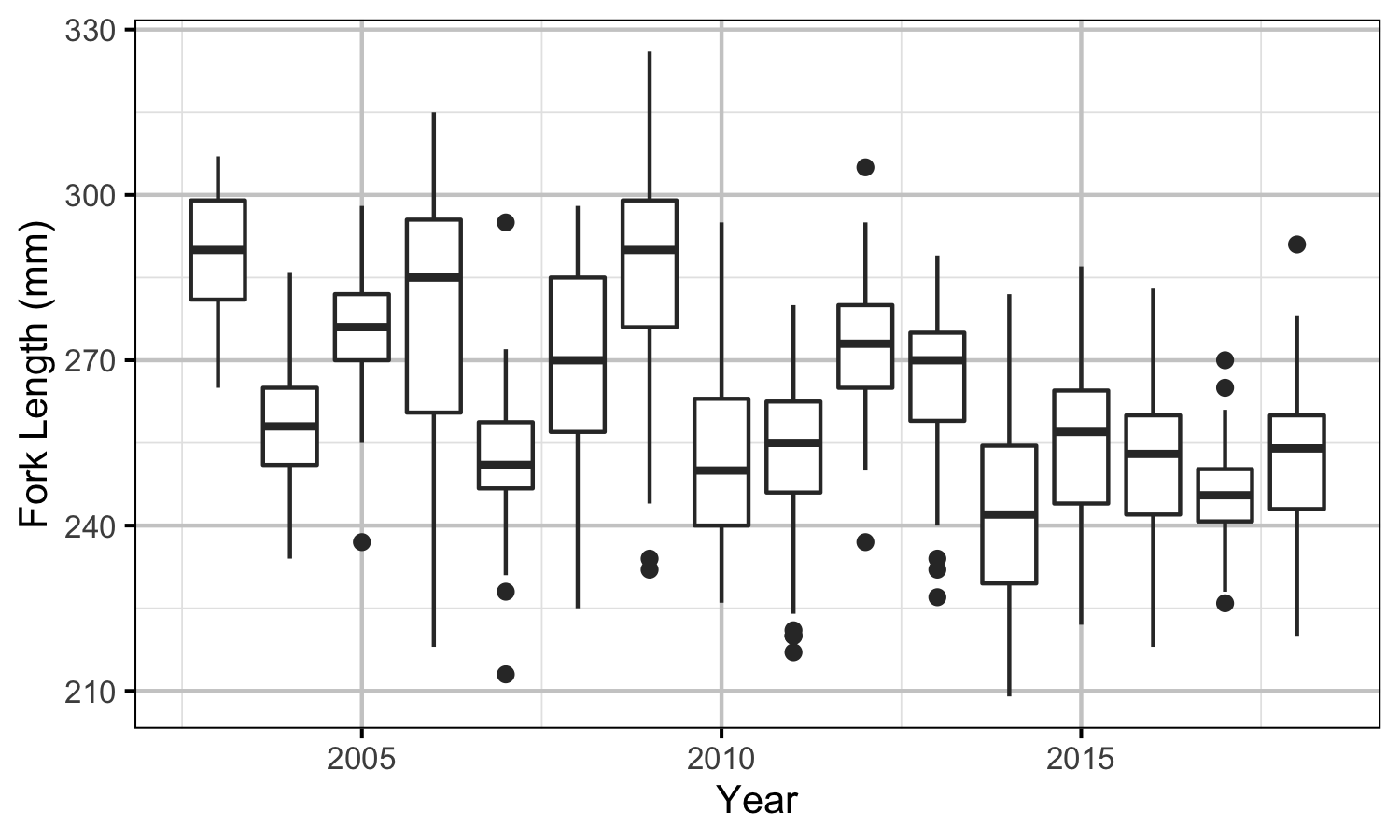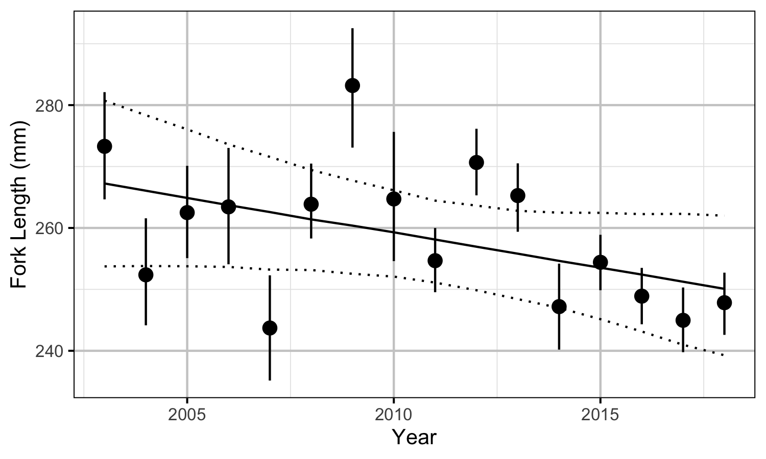 The fork length of age-3 Kokanee was analysed using a hierarchical Bayesian generalized mixed effects model.