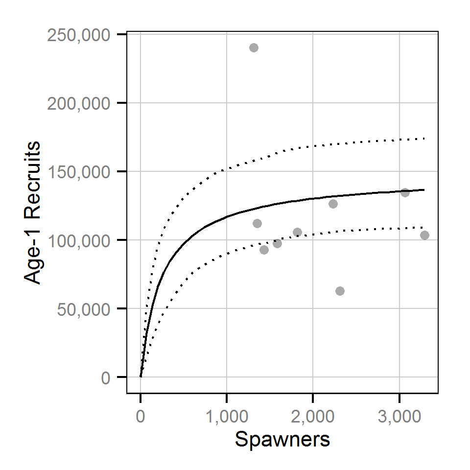 The relationship between the number of spawners and the number of age-1 recruits the following spring was estimated using a Beverton-Holt stock-recruitment model.