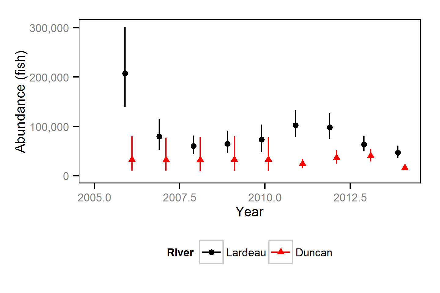 Thorley, J.L. and Hogan, P.M. (2014) Lardeau and Lower Duncan River Juvenile Rainbow Trout Analysis 2014. A Poisson Consulting Analysis Report. URL: https://www.poissonconsulting.ca/f/493327817.