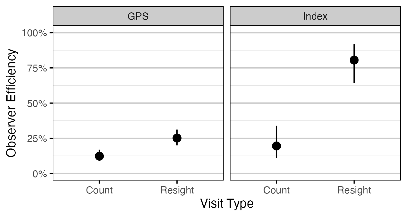 - The observer efficiency at marking sites varies by study design (GPS versus Index).