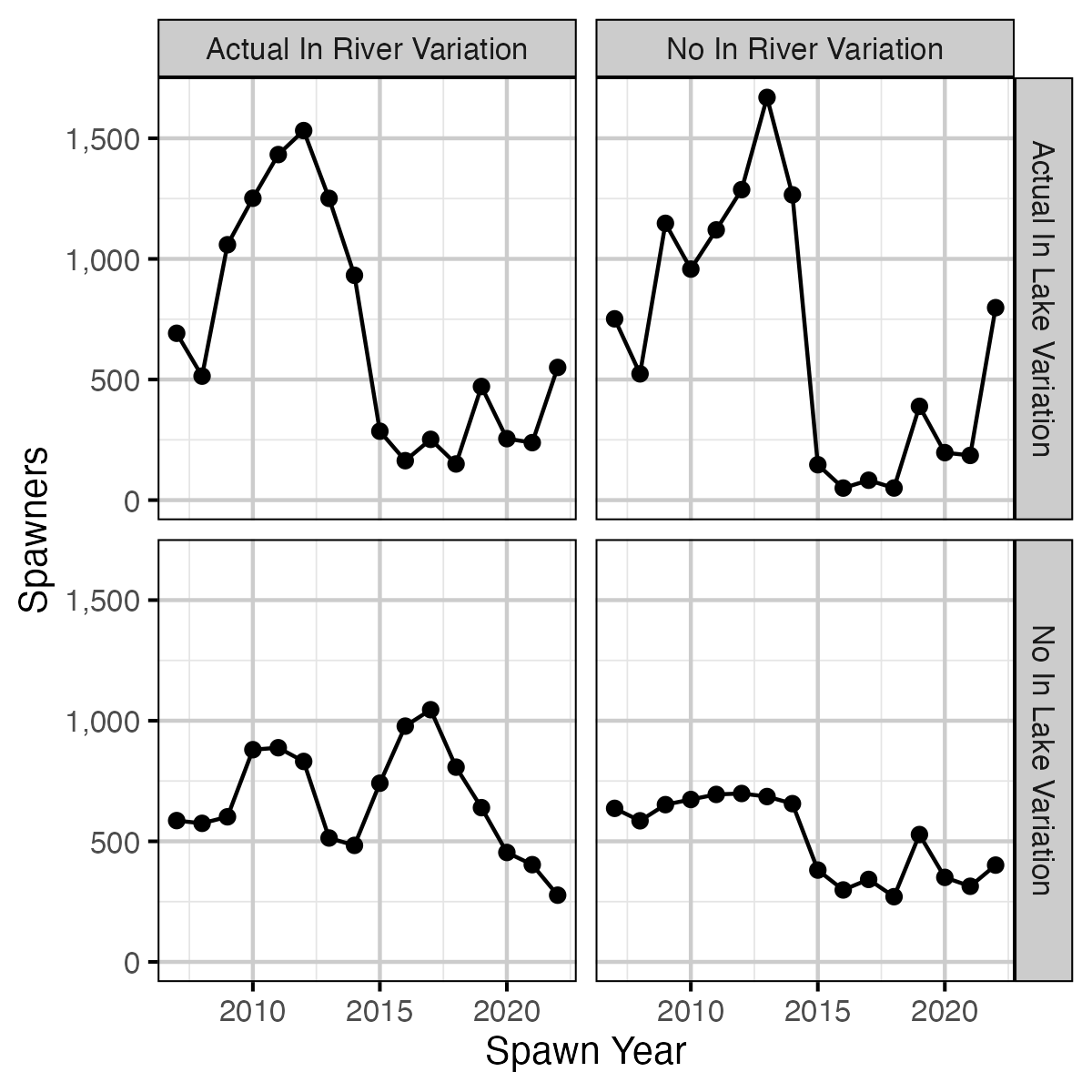 - Estimate the expected number of spawners without in river and/or in lake variation.