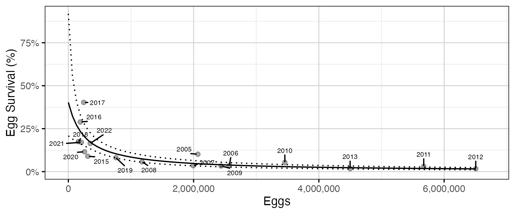 - Estimate the stock-recruitment relationship between the egg deposition and the abundance of age-1 recruits the following spring.