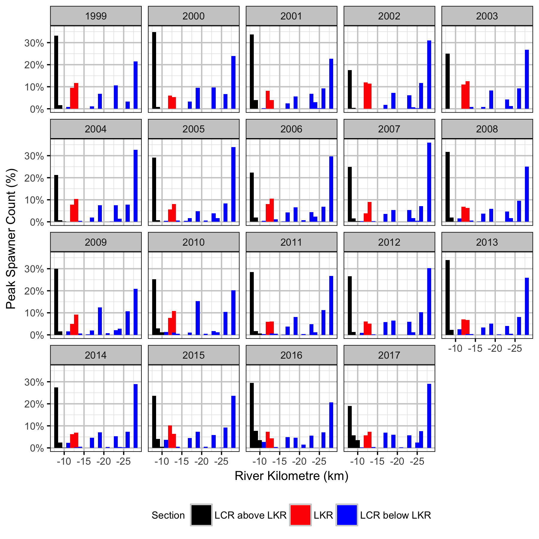 The proportion of fish were plotted by river km and year for the day of the peak spawner count to visualize the distribution of spawning. The Shannon Index \(H\) was calculated for each year where \[ H = - \sum{p_i log(p_i)}\] and \(p_i\) is the proportion of the spawners at the \(i\)th site with a positive count.
