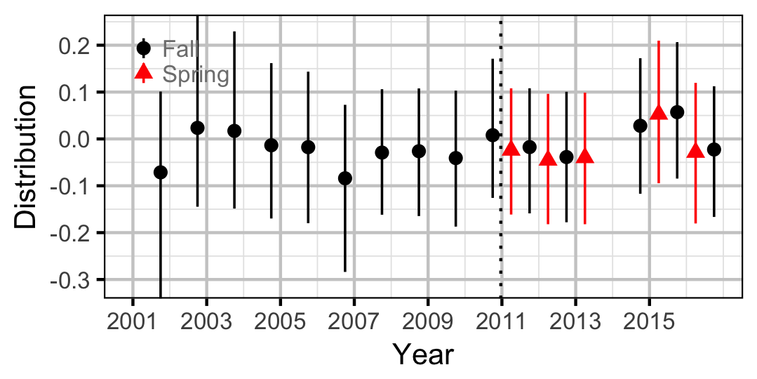 - Is there a change in spatial distribution of adult life stages of fish using the MCR that corresponds with the implementation of a year-round minimum flow?