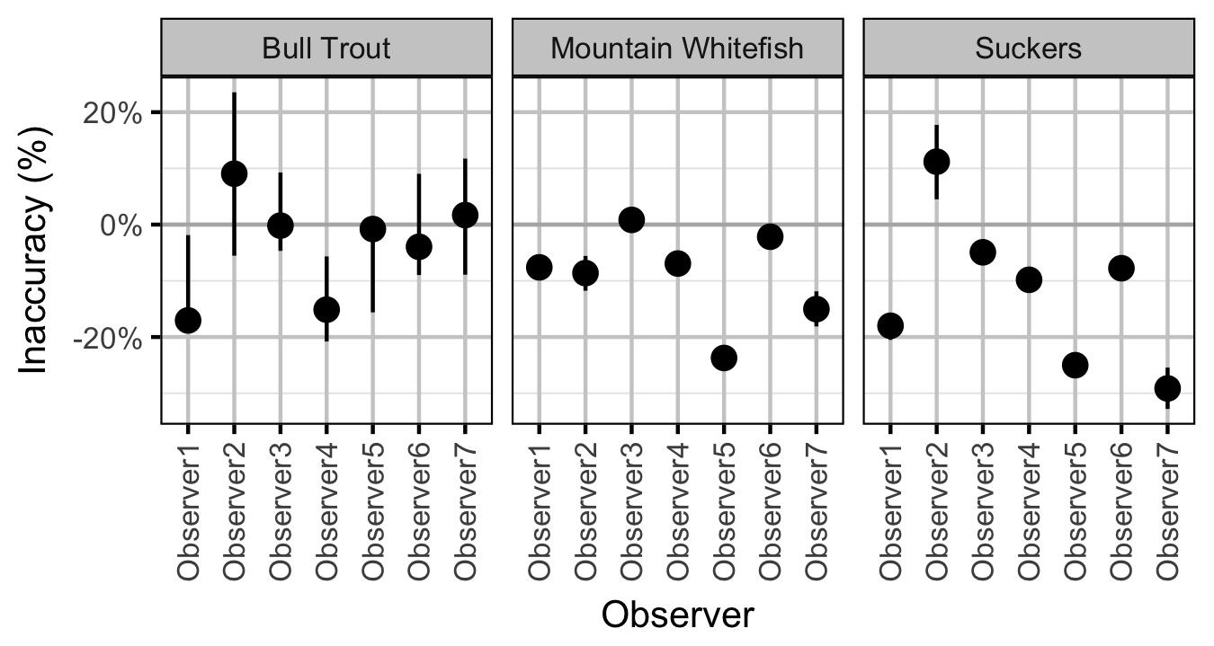 The bias (accuracy) and error (precisions) in observer’s fish length estimates were quantified using a model with a categorical distribution that compared the proportions of fish in different length-classes for each observer to the equivalent proportions for the measured fish.