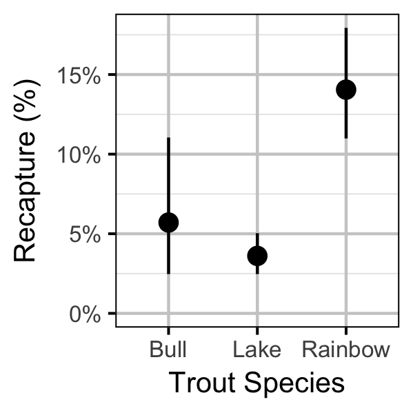 - Reporting of recaptured fish with one or more T-bar tags is between 90 and 100%.