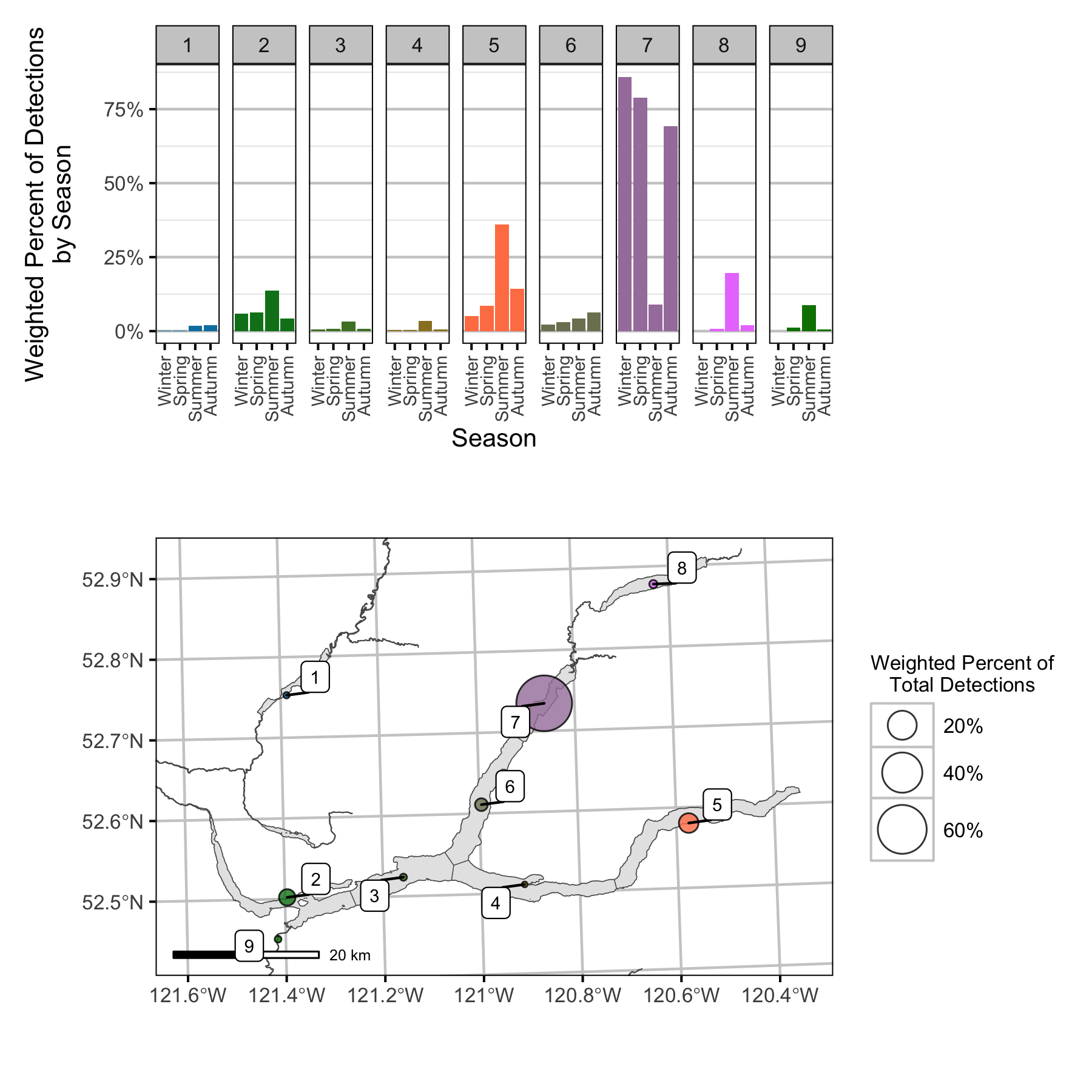 Figure 5. Percent of Bull Trout detections by section and season, weighted by receiver coverage.