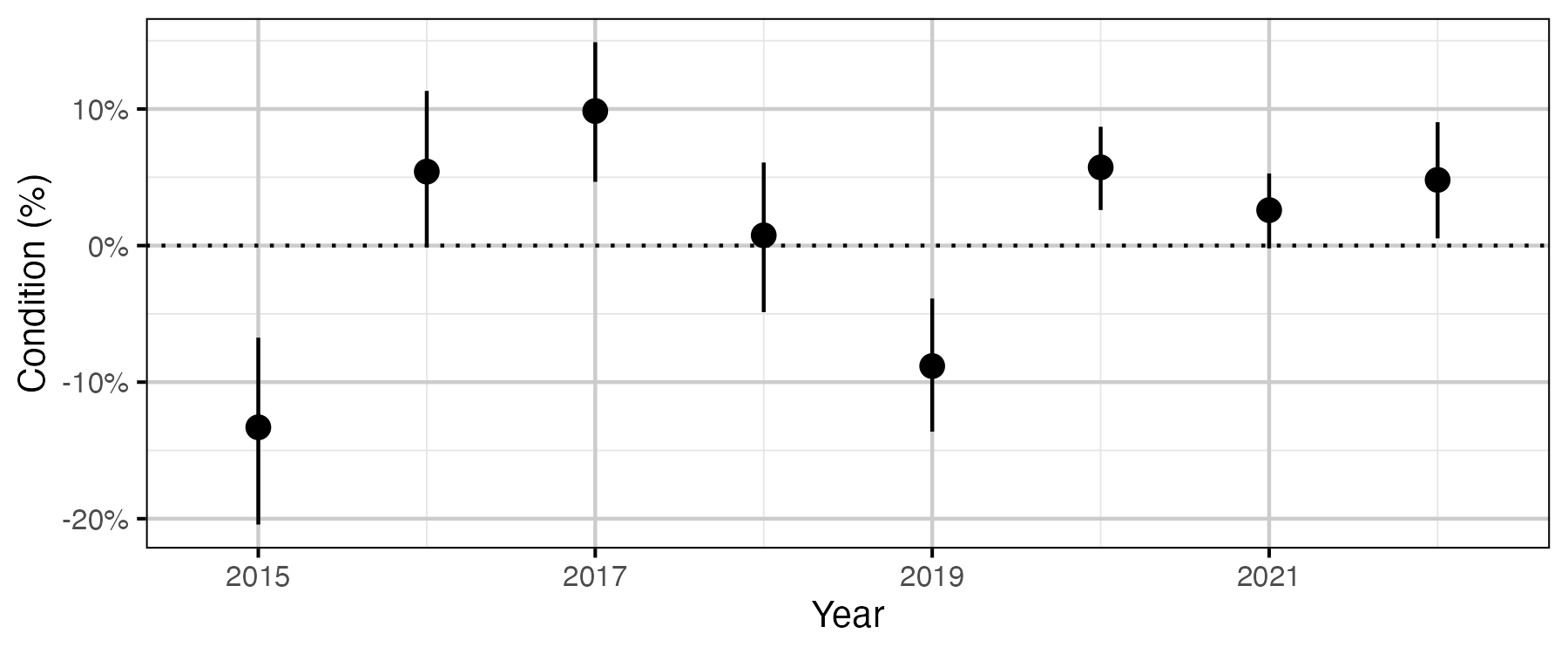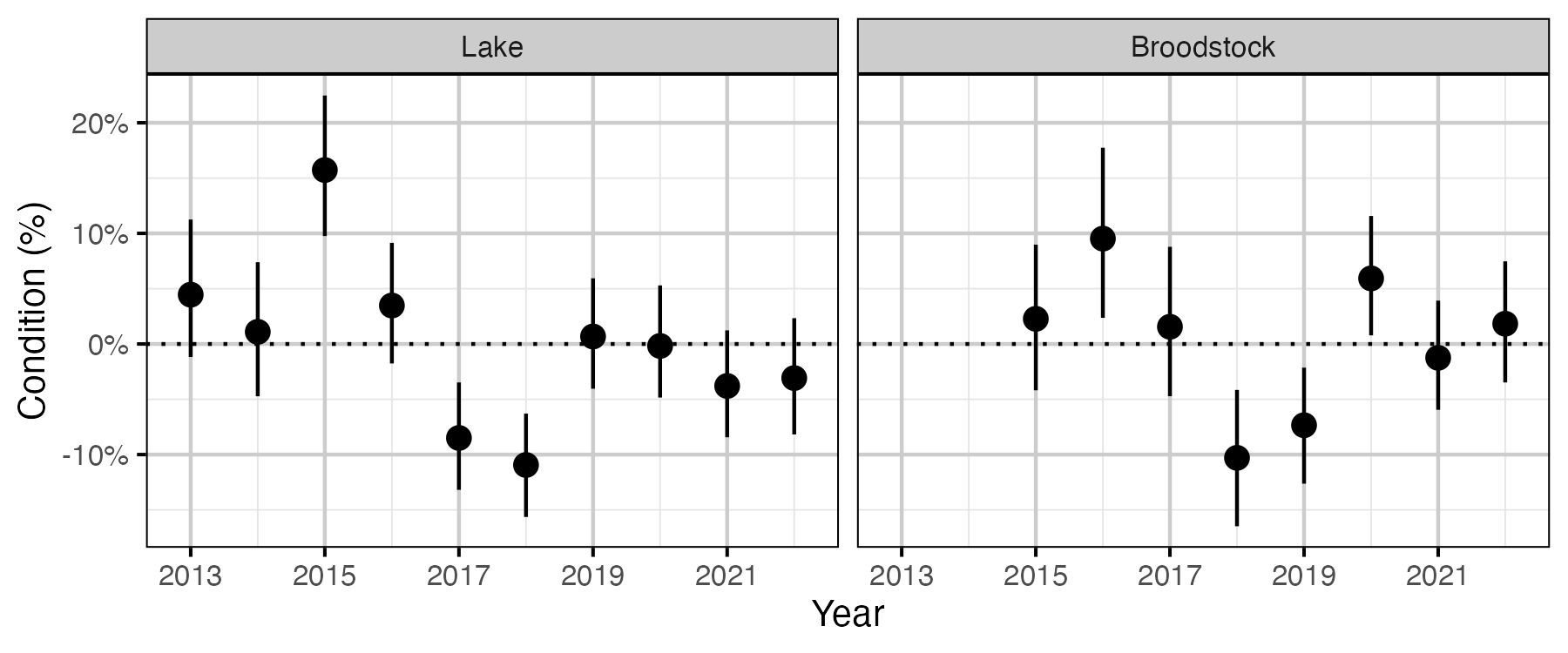 Figure 52. The percent change in body weight of a 700 mm Rainbow Trout spawner relative to an in-lake capture, by year (with 95% CRIs).