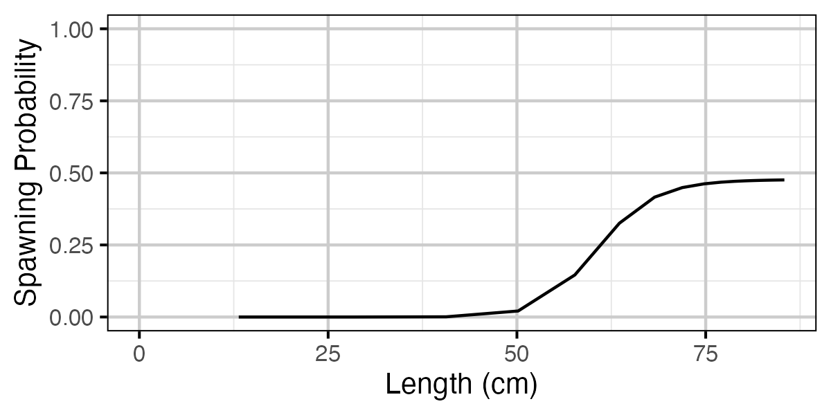 where \(L_s\) is the length at which 50% of fish are mature, \(es\) is the probability of a mature fish spawning and \(S_p\) is the maturity (as a function of length) power.